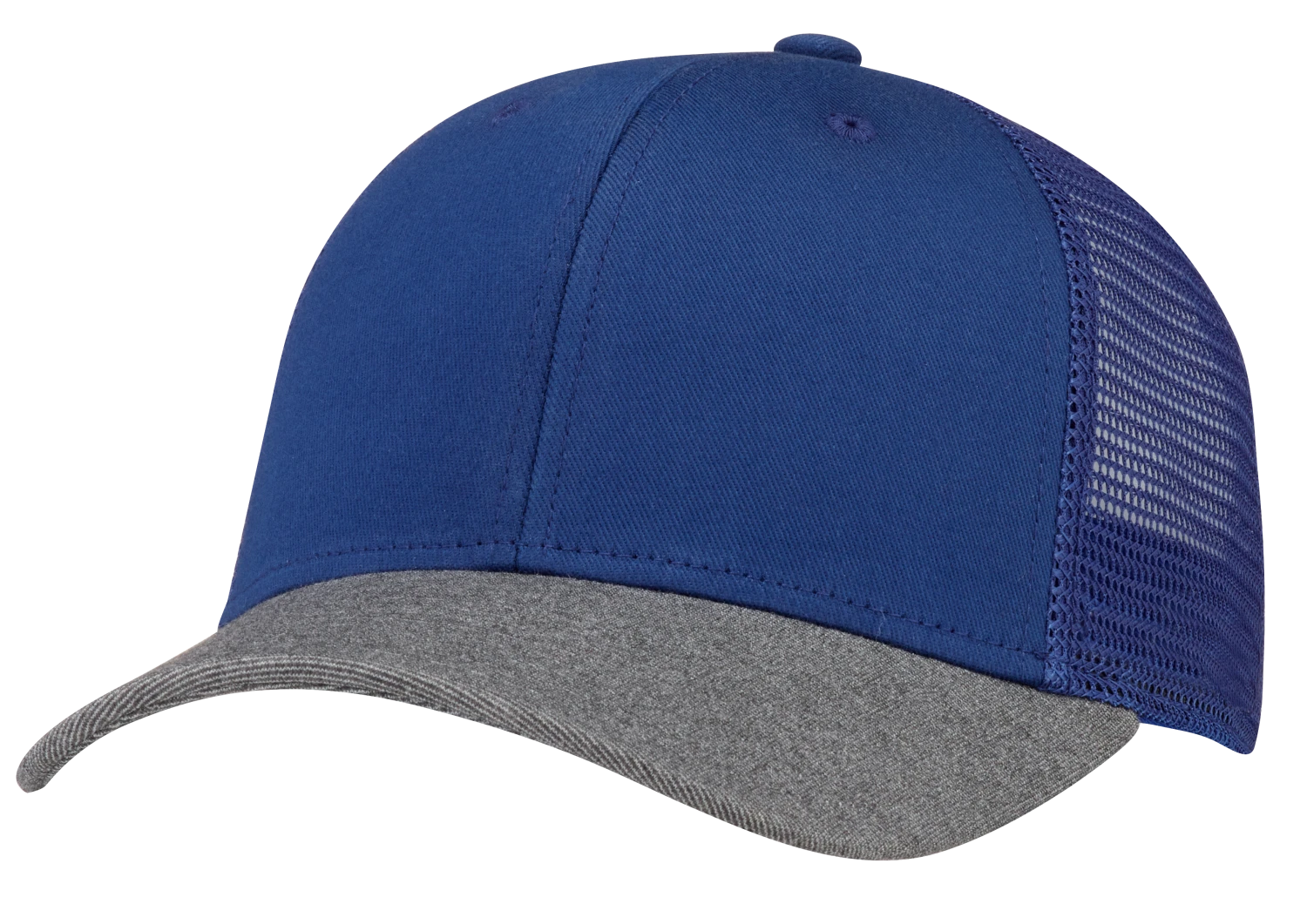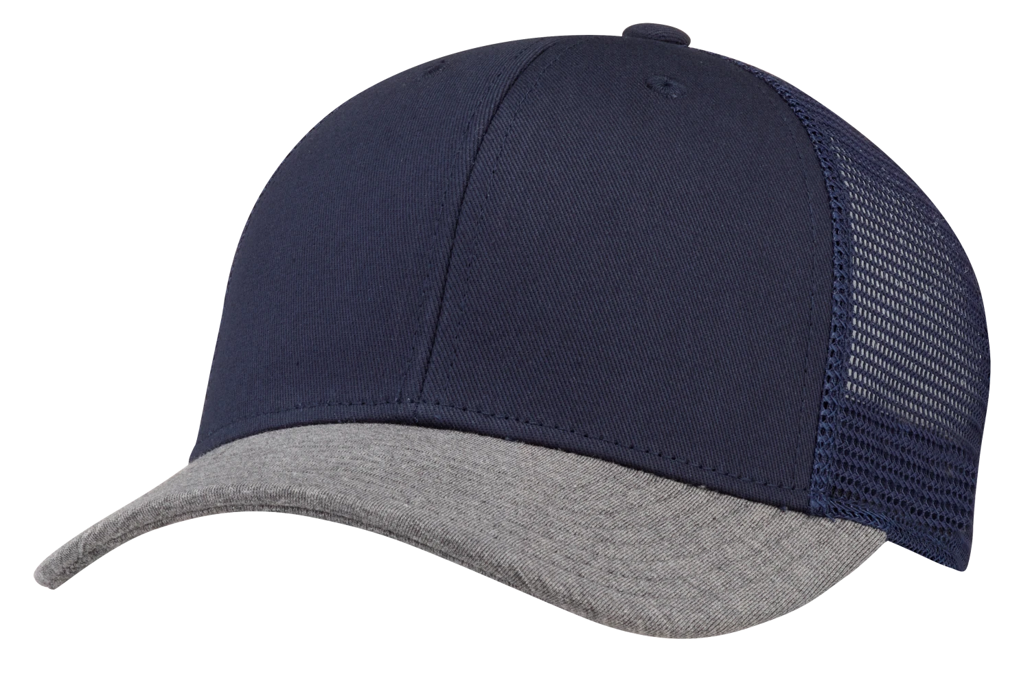 Structured mid-crown trucker cap with washed-cotton front panels and mesh back panels. Adjustable snap closure.